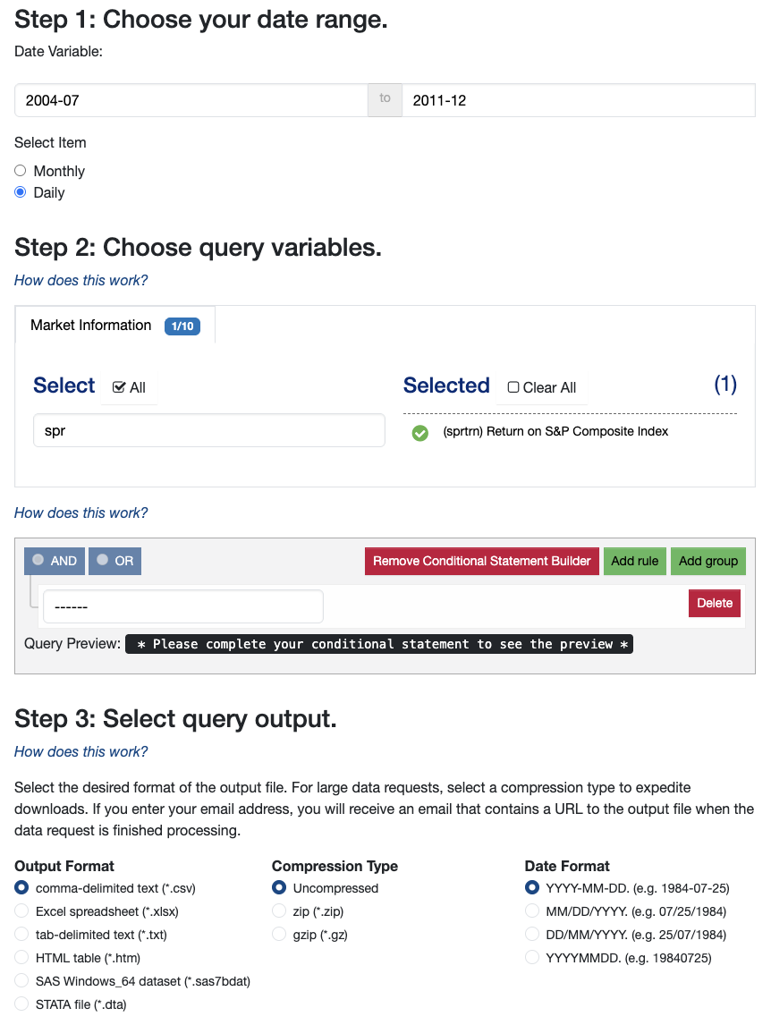 - CRSP data for the S&P500 composite index return series (not individual stocks, daily, July 1 2004 to Dec 31 2011)